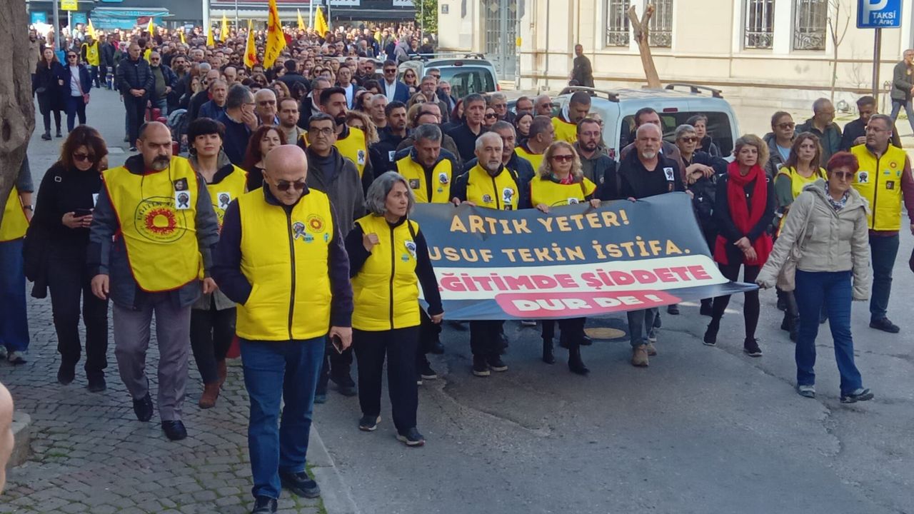 Eğitim Sen’in İstanbul Çekmeköy’de öğretmen Fatma Nur Çelik’in yaşamını yitirdiği bıçaklı saldırı sonrası aldığı bir günlük iş bırakma kararı kapsamında İzmir’de eğitim emekçileri Konak YKM önünde toplandı. Alkışlar ve düdükler eşliğinde bir araya gelen kalabalık, sloganlarla İl Milli Eğitim Müdürlüğü önüne yürüdü.