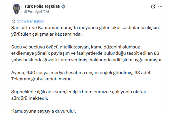 "Şanlıurfa ve Kahramanmaraş'ta meydana gelen okul saldırılarına ilişkin yürütülen çalışmalar kapsamında; suçu ve suçluyu övücü nitelik taşıyan, kamu düzenini olumsuz etkilemeye yönelik paylaşım ve faaliyetlerde bulunduğu tespit edilen 83 şahıs hakkında gözaltı kararı verilmiş, haklarında adli işlem uygulanmıştır. Ayrıca, 940 sosyal medya hesabına erişim engeli getirilmiş, 93 Telegram grubu kapatılmıştır. Şüphelilerle ilgili adli süreçler ilgili birimlerimizce çok yönlü olarak sürdürülmektedir."