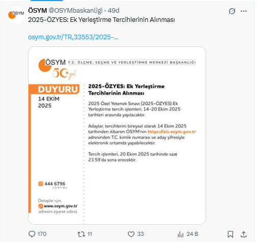 Açıklamaya göre adaylar, tercihlerini bireysel olarak https://ais.osym.gov.tr adresinden vatandaşlık numaraları ve aday şifreleriyle elektronik ortamda yapabilecek. Tercih işlemleri, 20 Ekim 2025 saat 23.59’da son bulacak. Adaylar, 2025-ÖZYES ek yerleştirme ile ilgili genel bilgiler ve tablolara ÖSYM'nin internet sitesi üzerinden ulaşabilecek.