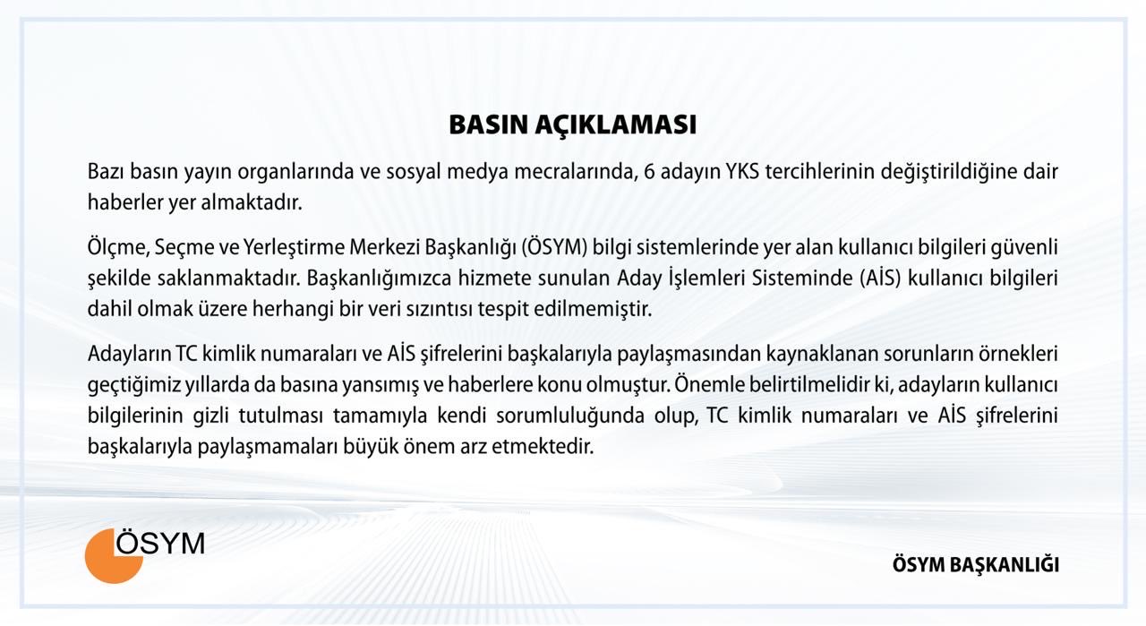 "ÖSYM, bilgi sistemlerinde yer alan kullanıcı bilgileri güvenli şekilde saklanmaktadır. Başkanlığımızca hizmete sunulan Aday İşlemleri Sisteminde (AIS) kullanıcı bilgileri dahil olmak üzere herhangi bir veri sızıntısı tespit edilmemiştir. Adayların TC kimlik numaraları ve AİS şifrelerini başkalarıyla paylaşmasından kaynaklanan sorunların örnekleri geçtiğimiz yıllarda da basına yansımış ve haberlere konu olmuştur. Önemle belirtilmelidir ki, adayların kullanıcı bilgilerinin gizli tutulması tamamıyla kendi sorumluluğunda olup, TC kimlik numaraları ve AIS şifrelerini başkalarıyla paylaşmamaları büyük önem arz etmektedir."