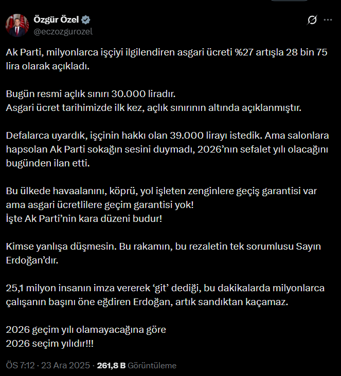 "AK Parti, milyonlarca işçiyi ilgilendiren asgari ücreti %27 artışla 28 bin 75 lira olarak açıkladı. Bugün resmi açlık sınırı 30.000 liradır. Asgari ücret tarihimizde ilk kez, açlık sınırının altında açıklanmıştır. Defalarca uyardık, işçinin hakkı olan 39.000 lirayı istedik. Ama salonlara hapsolan AK Parti sokağın sesini duymadı, 2026’nın sefalet yılı olacağını bugünden ilan etti. Bu ülkede havaalanını, köprü, yol işleten zenginlere geçiş garantisi var ama asgari ücretlilere geçim garantisi yok! İşte AK Parti’nin kara düzeni budur! Kimse yanlışa düşmesin. Bu rakamın, bu rezaletin tek sorumlusu Sayın Erdoğan’dır. 25,1 milyon insanın imza vererek ‘git’ dediği, bu dakikalarda milyonlarca çalışanın başını öne eğdiren Erdoğan, artık sandıktan kaçamaz. 2026 geçim yılı olamayacağına göre 2026 seçim yılıdır!!!"