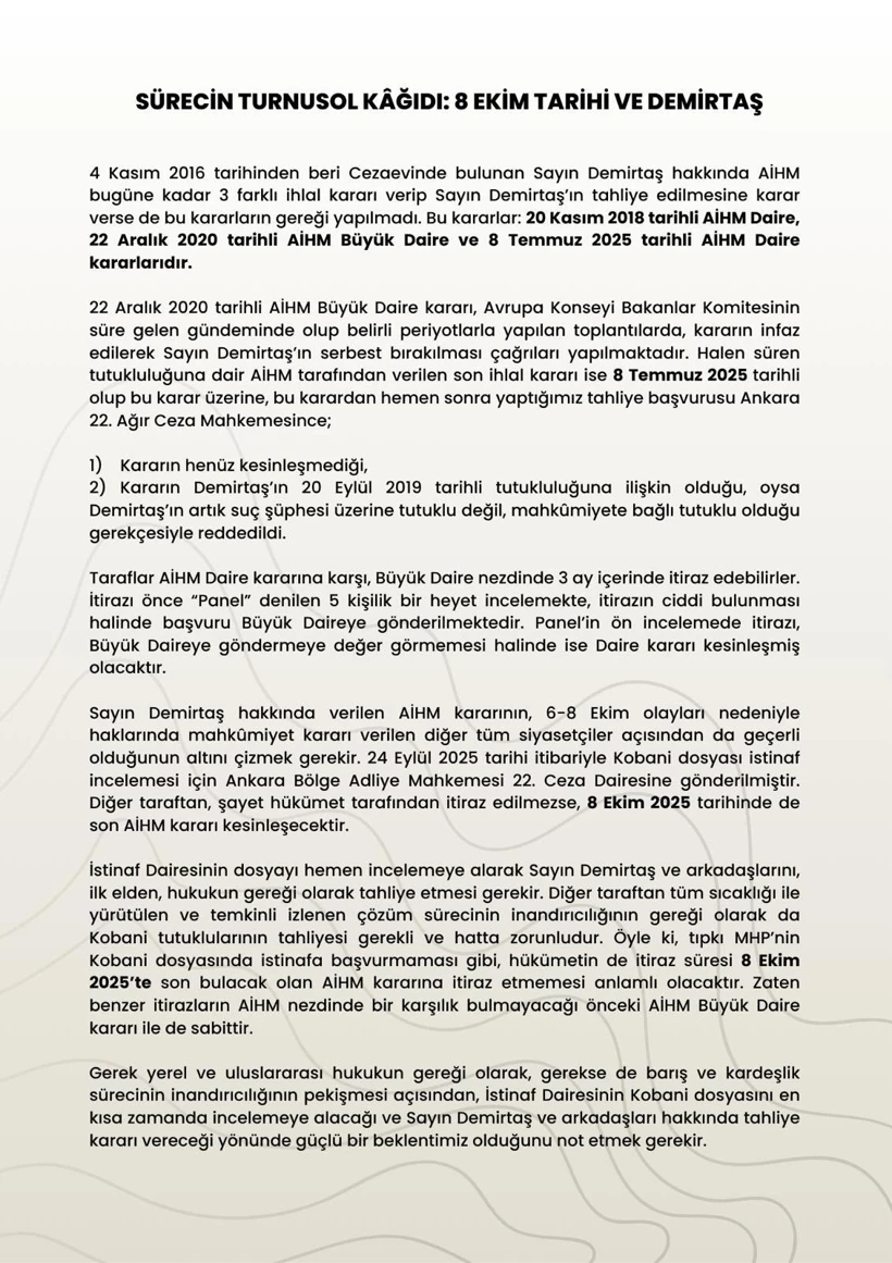 Odatv'nin edindiği bilgiye göre, Edirne F Tipi Cezaevi'nde tutuklu bulunan eski Halkların Demokratik Partisi (HDP) Eş Genel Başkanı Selahattin Demirtaş’ın avukatı Mahsuni Karaman, 8 Ekim tarihinin Demirtaş’ın yargı süreci açısından kritik olduğunu geçtiğimiz günlerde açıkladı. Karaman, Avrupa İnsan Hakları Mahkemesinin (AİHM) 20 Kasım 2018, 22 Aralık 2020 ve 8 Temmuz 2025 tarihli kararlarına rağmen Demirtaş’ın hala cezaevinde tutulduğunu hatırlattı. Ankara 22. Ağır Ceza Mahkemesinin son başvuruyu “kararın kesinleşmediği” gerekçesiyle reddettiğini söyledi.