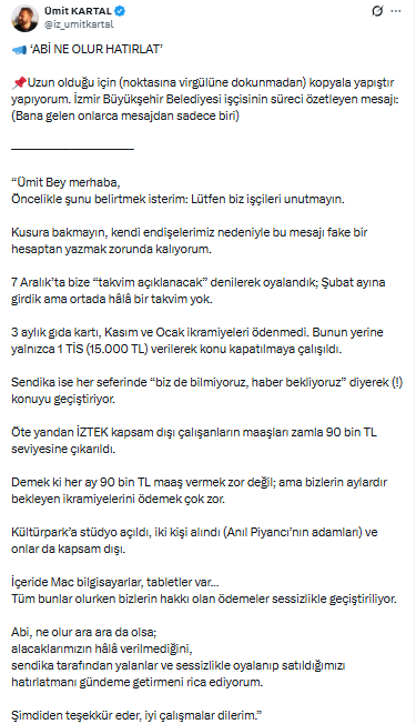 “Ümit Bey merhaba, Öncelikle şunu belirtmek isterim: Lütfen biz işçileri unutmayın. Kusura bakmayın, kendi endişelerimiz nedeniyle bu mesajı fake bir hesaptan yazmak zorunda kalıyorum. 7 Aralık’ta bize “takvim açıklanacak” denilerek oyalandık; Şubat ayına girdik ama ortada hâlâ bir takvim yok. 3 aylık gıda kartı, Kasım ve Ocak ikramiyeleri ödenmedi. Bunun yerine yalnızca 1 TİS (15.000 TL) verilerek konu kapatılmaya çalışıldı. Sendika ise her seferinde “biz de bilmiyoruz, haber bekliyoruz” diyerek (!) konuyu geçiştiriyor. Öte yandan İZTEK kapsam dışı çalışanların maaşları zamla 90 bin TL seviyesine çıkarıldı. Demek ki her ay 90 bin TL maaş vermek zor değil; ama bizlerin aylardır bekleyen ikramiyelerini ödemek çok zor. Kültürpark’a stüdyo açıldı, iki kişi alındı (Anıl Piyancı’nın adamları) ve onlar da kapsam dışı. İçeride Mac bilgisayarlar, tabletler var… Tüm bunlar olurken bizlerin hakkı olan ödemeler sessizlikle geçiştiriliyor. Abi, ne olur ara ara da olsa; alacaklarımızın hâlâ verilmediğini, sendika tarafından yalanlar ve sessizlikle oyalanıp satıldığımızı hatırlatmanı gündeme getirmeni rica ediyorum. Şimdiden teşekkür eder, iyi çalışmalar dilerim.”