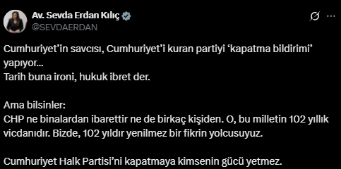 "Cumhuriyet’in savcısı, Cumhuriyet’i kuran partiyi ‘kapatma bildirimi’ yapıyor… Tarih buna ironi, hukuk ibret der. Ama bilsinler: CHP ne binalardan ibarettir ne de birkaç kişiden. O, bu milletin 102 yıllık vicdanıdır. Bizde, 102 yıldır yenilmez bir fikrin yolcusuyuz. Cumhuriyet Halk Partisi’ni kapatmaya kimsenin gücü yetmez"