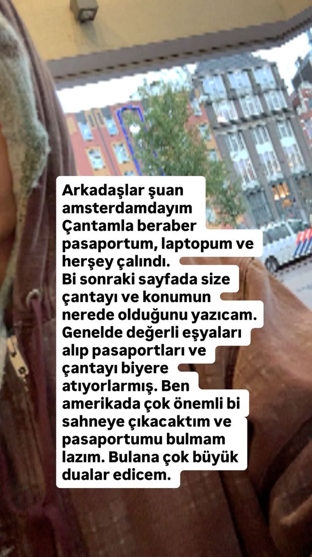 Aleyna Tilki, yaşadığı olayı takipçileriyle paylaştı. Tilki, "Arkadaşlar, şu an Amsterdam’dayım. Çantamla beraber pasaportum, laptopum ve her şeyim çalındı. Bir sonraki sayfada size çantayı ve konumun nerede olduğunu yazacağım. Genelde değerli eşyaları alıp pasaportları ve çantayı bir yere atıyorlarmış. Ben ABD'de çok önemli bir sahneye çıkacaktım ve pasaportumu bulmam lâzım. Bulana çok büyük dualar edeceğim" ifadelerini kullandı.