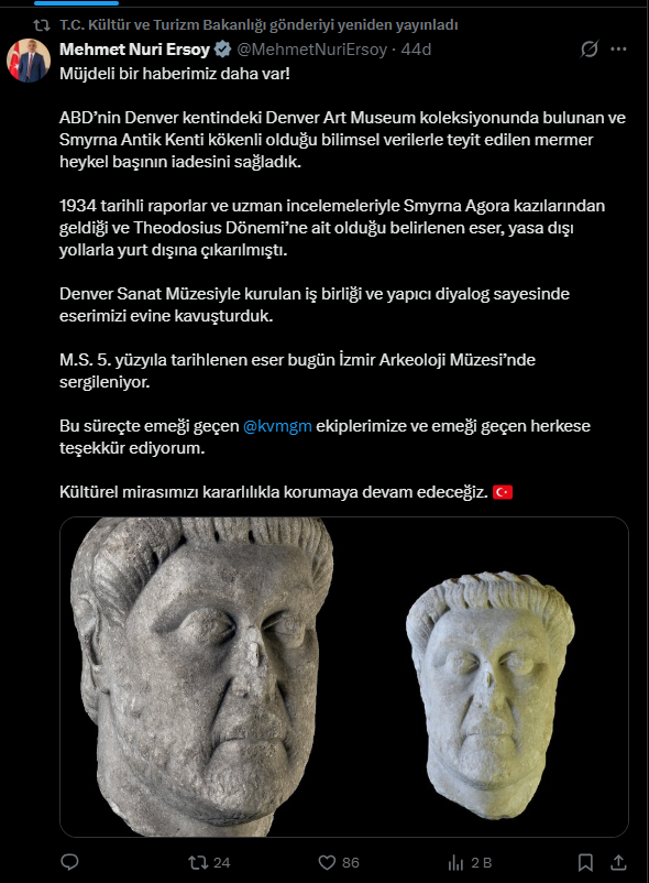 "Müjdeli bir haberimiz daha var. ABD'nin Denver kentindeki Denver Art Museum koleksiyonunda bulunan ve Smyrna Antik Kenti kökenli olduğu bilimsel verilerle teyit edilen mermer heykel başının iadesini sağladık. 1934 tarihli raporlar ve uzman incelemeleriyle Smyrna Agora kazılarından geldiği ve Theodosius Dönemine ait olduğu belirlenen eser, yasa dışı yollarla yurt dışına çıkarılmıştı. Denver Sanat Müzesiyle kurulan işbirliği ve yapıcı diyalog sayesinde eserimizi evine kavuşturduk. Milattan sonra 5. yüzyıla tarihlenen eser bugün İzmir Arkeoloji Müzesi'nde sergileniyor. Bu süreçte emeği geçen Kültür Varlıkları ve Müzeler Genel Müdürlüğü ekiplerimize ve emeği geçen herkese teşekkür ediyorum. Kültürel mirasımızı kararlılıkla korumaya devam edeceğiz."