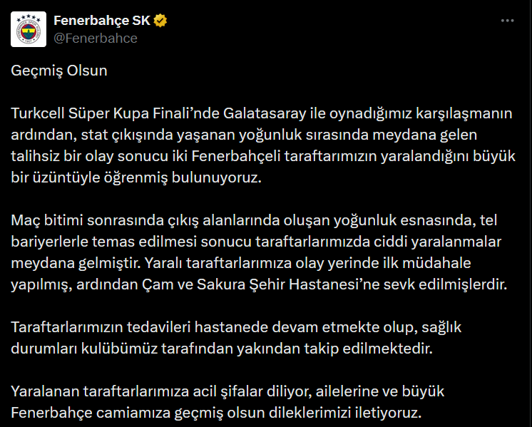 "Turkcell Süper Kupa Finali'nde Galatasaray ile oynadığımız karşılaşmanın ardından, stat çıkışında yaşanan yoğunluk sırasında meydana gelen talihsiz bir olay sonucu iki Fenerbahçeli taraftarımızın yaralandığını büyük bir üzüntüyle öğrenmiş bulunuyoruz.