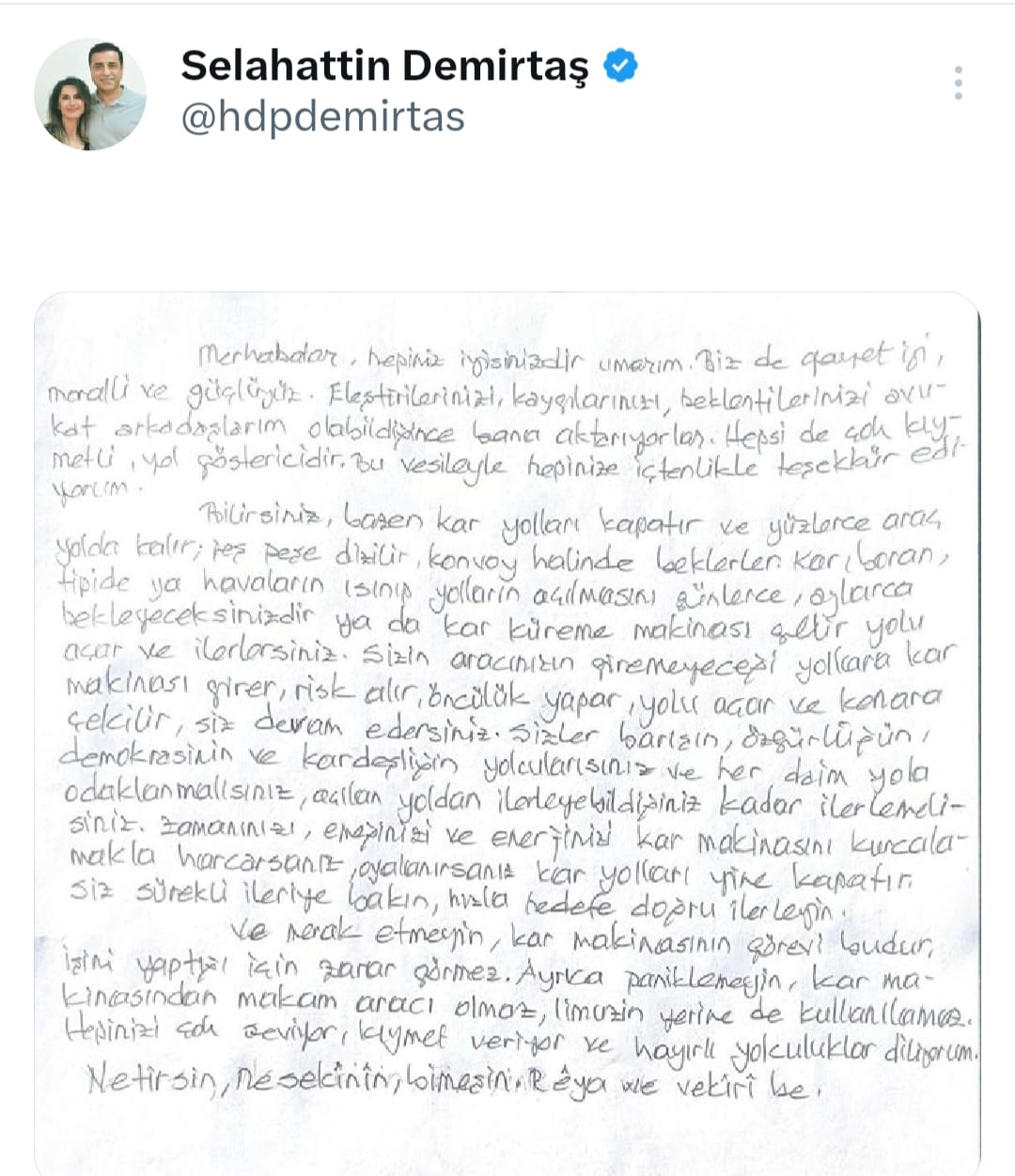 Demirtaş, "Merhabalar, hepiniz iyisinizdir umarım. Biz de gayet iyi, moralli ve güçlüyüz. Eleştirilerinizi, kaygılarınızı, beklentilerinizi avukat arkadaşlarım olabildiğince bana aktarıyorlar. Hepsi de çok kıymetli, yol göstericidir. Bu vesileyle hepinize içtenlikle teşekkür ediyorum." dedi.