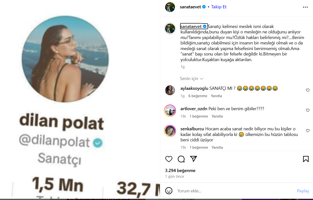 Usta oyuncu Tamer Levent, Polat’ın sosyal medya hesabındaki biyografi kısmına "sanatçı" yazmasına tepki gösterdi.