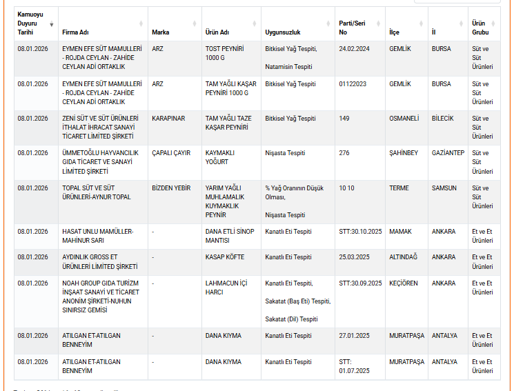 Listenin önemli bir bölümünü süt ve süt ürünleri oluşturdu. Bursa’nın Gemlik ilçesi ile Bilecik’in Osmaneli ilçesinde üretilen tost peyniri ve tam yağlı kaşar peyniri ürünlerinde bitkisel yağ tespiti yapıldı. Gaziantep’in Şahinbey ilçesinde bir firmaya ait kaymaklı yoğurtta nişasta tespit edilirken Samsun’un Terme ilçesinde üretilen muhlamalık peynirde yağ oranının düşük olduğu ve nişasta kullanıldığı belirlendi.