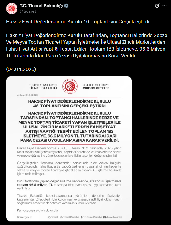 "Haksız Fiyat Değerlendirme Kurulu tarafından, toptancı hallerinde sebze ve meyve toptan ticareti yapan işletmeler ile ulusal zincir marketlerden fahiş fiyat artışı yaptığı tespit edilen toplam 183 işletmeye, 96,6 milyon lira tutarında idari para cezası uygulanmasına karar verilmiştir. Ticaret Bakanlığı koordinasyonunda yürütülen denetim faaliyetleri kapsamında, tüketicilerimizin korunması ve piyasada adil fiyat oluşumunun sağlanması amacıyla denetimler kararlılıkla sürdürülecektir."