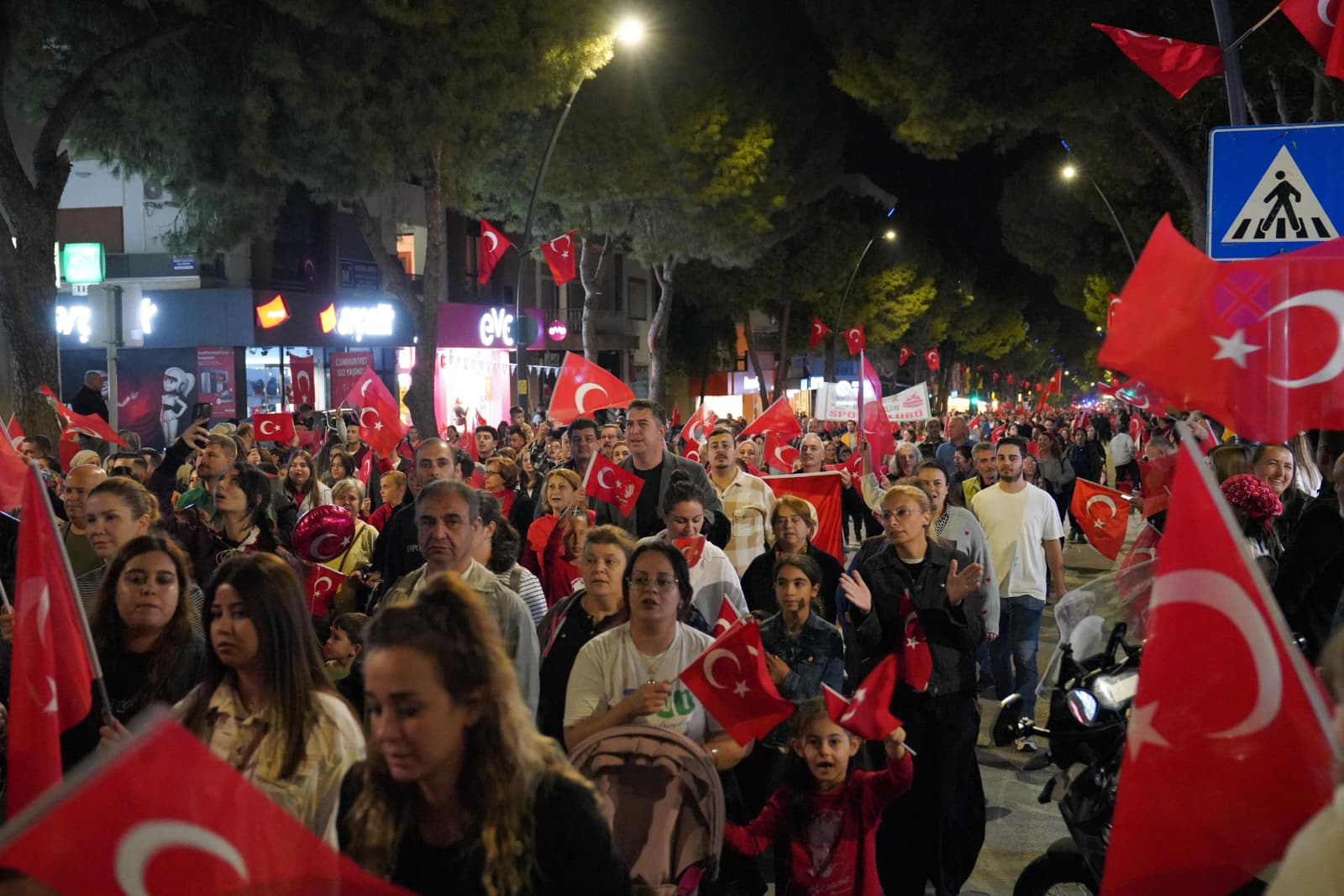 Saat 19.23’te başlayan yürüyüşte, vatandaşlar ellerinde bayraklarla İstasyon Caddesi boyunca yürüdüler. Okulların bando takımlarının da katıldığı kortejde, marşlar ve sloganlar atanlara, vatandaşlar evlerinin balkon ve pencerelerinden katıldılar.