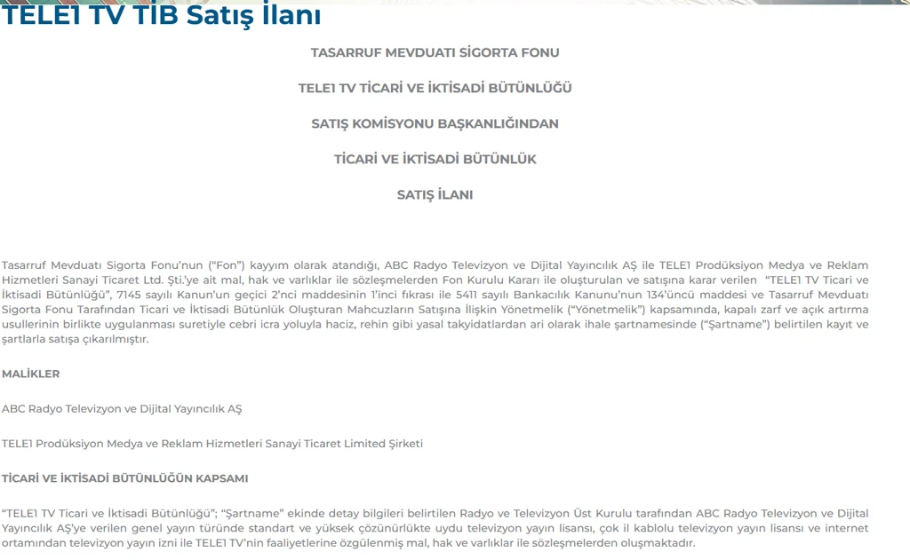 "Tasarruf Mevduatı Sigorta Fonu’nun (“Fon”) kayyım olarak atandığı, ABC Radyo Televizyon ve Dijital Yayıncılık AŞ ile TELE1 Prodüksiyon Medya ve Reklam Hizmetleri Sanayi Ticaret Ltd. Şti.’ye ait mal, hak ve varlıklar ile sözleşmelerden Fon Kurulu Kararı ile oluşturulan ve satışına karar verilen “TELE1 TV Ticari ve İktisadi Bütünlüğü”, 7145 sayılı Kanun’un geçici 2’nci maddesinin 1’inci fıkrası ile 5411 sayılı Bankacılık Kanunu’nun 134’üncü maddesi ve Tasarruf Mevduatı Sigorta Fonu Tarafından Ticari ve İktisadi Bütünlük Oluşturan Mahcuzların Satışına İlişkin Yönetmelik (“Yönetmelik”) kapsamında, kapalı zarf ve açık artırma usullerinin birlikte uygulanması suretiyle cebri icra yoluyla haciz, rehin gibi yasal takyidatlardan ari olarak ihale şartnamesinde (“Şartname”) belirtilen kayıt ve şartlarla satışa çıkarılmıştır. TELE1 TV Ticari ve İktisadi Bütünlüğü”nün muhammen bedeli 28.000.000.- (Yirmisekizmilyon) TL’dir.