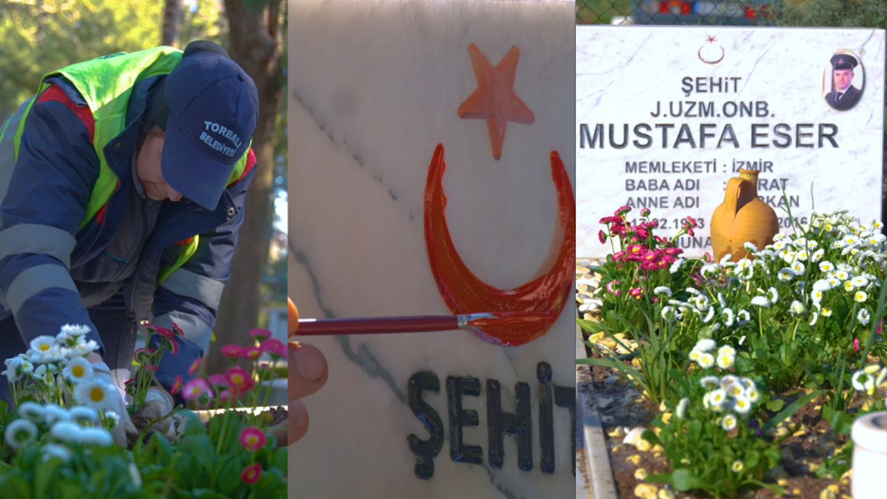 Torbalı Belediyesi ekipleri, yağmur sonrası kirlenen mezar taşlarını tek tek temizledi, şehitlerin isimleri yeniden boyandı, mezarlıklar çiçeklendirildi.