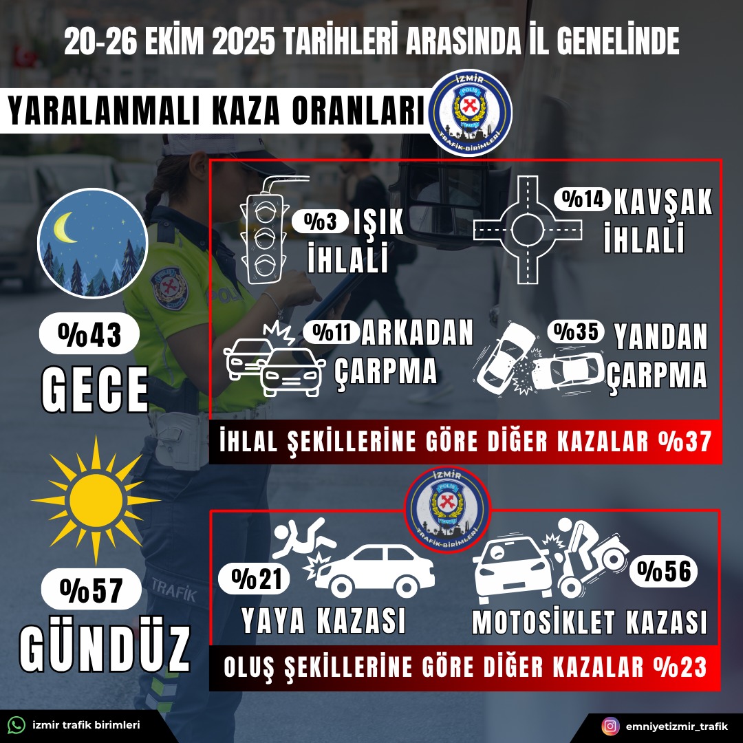 İzmir Trafik Birimlerinin haftalık denetimlerine göre motosiklet kazaları, İzmir'deki trafik kazalarının yüzde 56’sını oluşturuyor. İzmir'de kazaların yüzde 57’si gündüz saatlerinde, yüzde 43’ü ise gece gerçekleşti.