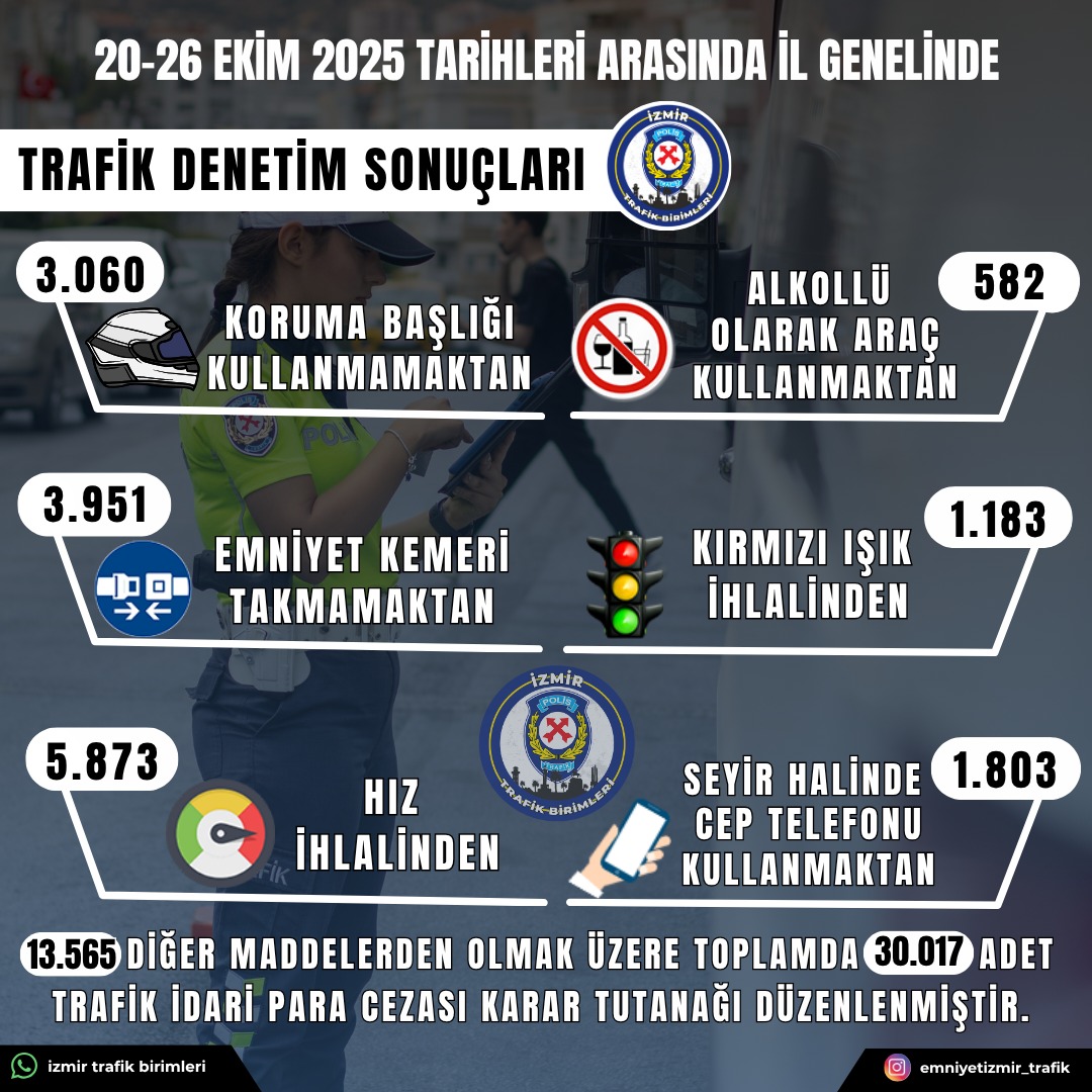 İzmir Trafik Birimleri tarafından yapılan haftalık denetimlerde çarpıcı sonuçlar ortaya çıktı. İzmir'deki trafik güvenliğini tehdit eden ihlaller ve kazaların nedenleri kamuoyuyla paylaşıldı. 20-26 Ekim 2025 tarihleri arasında toplam 30 bin 17 ceza kesildi. İşte İzmirlileri yakından ilgilendiren o veriler...