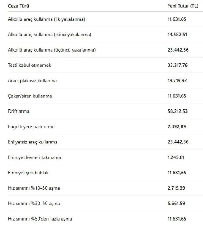 Yeniden Değerleme Oranı’na göre 2026 itibarıyla uygulanacak trafik cezaları yeniden belirlendi. Emniyet kemeri takmama, takip mesafesine uymama, kask takmadan motosiklet kullanma ve trafik sigortası olmadan trafiğe çıkma gibi ihlallerin cezası 993 TL’den 1.246 TL’ye yükselecek. Yeni yılda en düşük radar cezası ise 2.719 TL olarak uygulanacak.