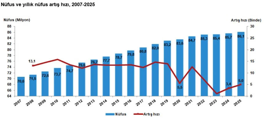 Yıllık nüfus artış hızı 2024 yılında binde 3,4 olarak kaydedilirken 2025 yılında binde 5 oldu.