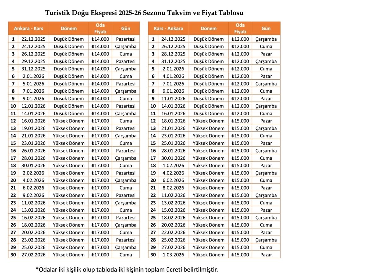 TCDD’nin açıkladığı listeye göre, Turistik Doğu Ekspresi’nde yer alan iki kişilik odaların fiyatları 12 bin ile 17 bin lira arasında değişiyor. Kişi başı ücretler ise 6 bin ile 8 bin 500 lira arasında.