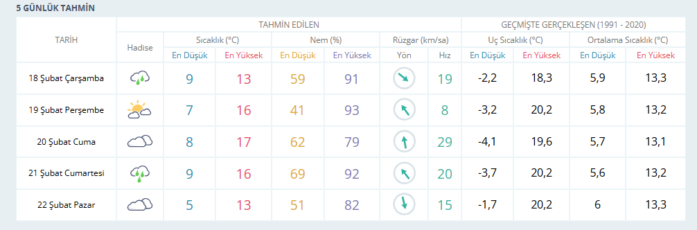 Meteoroloji verilerine göre İzmir’de 18 Şubat Çarşamba günü sağanak yağış bekleniyor ve sıcaklık 13 dereceye düşecek. 19 Şubat Perşembe günü parçalı bulutlu bir hava ve 16 derece civarında sıcaklık tahmin ediliyor. 20 Şubat Cuma günü bulutlu bir gün öngörülürken sıcaklık 17 dereceye yükselecek. 21 Şubat Cumartesi günü sağanak yağış tekrar etkili olacak ve sıcaklık 16 derece civarında seyredecek. 22 Şubat Pazar günü ise bulutlu ve 13 derece civarında bir hava bekleniyor.