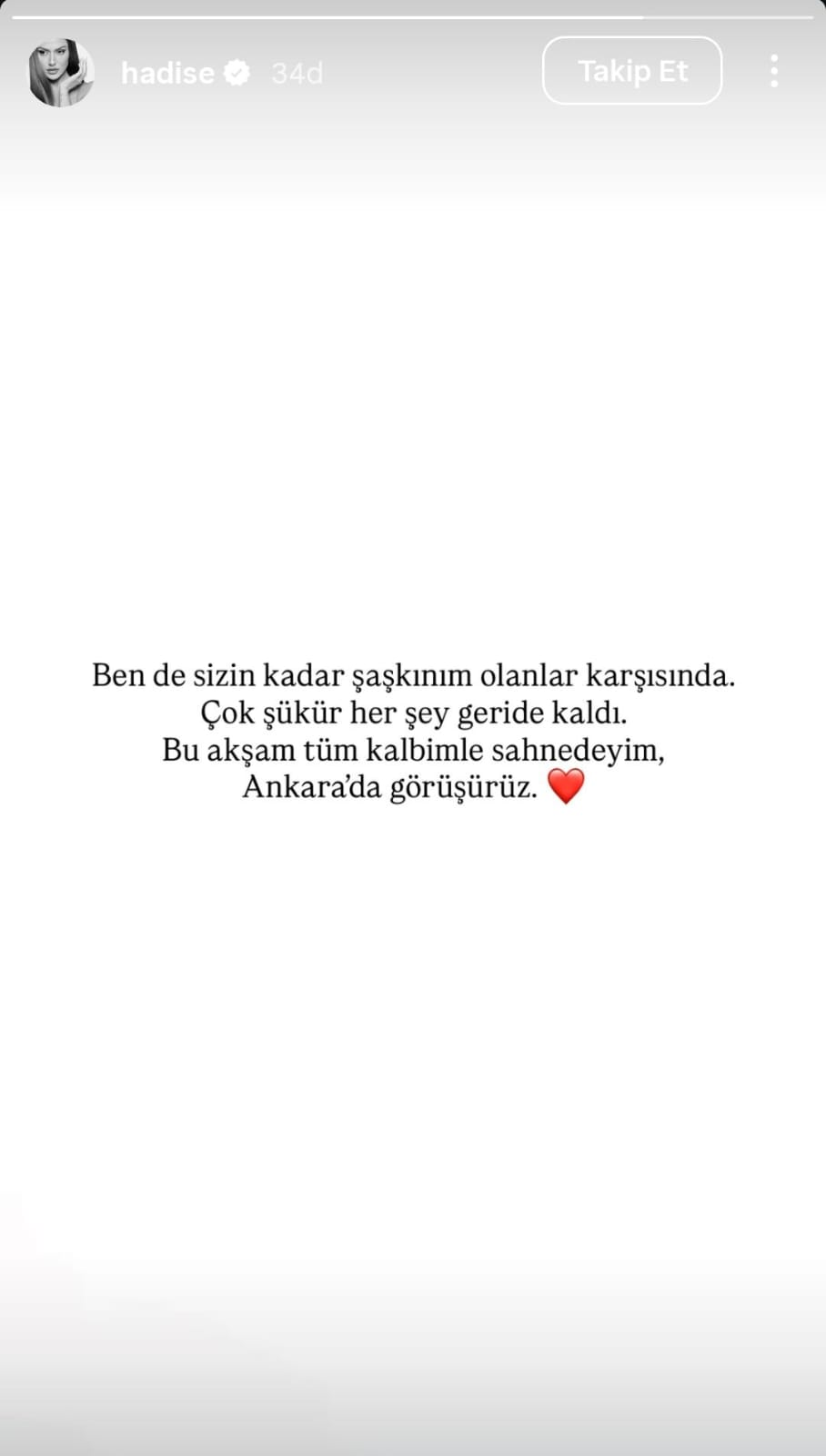 "Ben de sizin kadar şaşkınım olanlar karşısında. Çok şükür her şey geride kadı. Bu akşam tüm kalbimle sahnedeyim, Ankara'da görüşürüz."