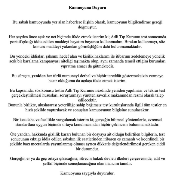Bu süreçte, yeniden her türlü numuneyi derhal ve hiçbir tereddüt göstermeksizin vermeye hazır olduğumu da açıkça ifade etmek isterim. Bu kapsamda; söz konusu testin Adli Tıp Kurumu nezdinde yeniden yapılması ve tekrar test gerçekleştirilmesi hususları, soruşturmayı yürüten savcılık makamından resmi olarak talep edilecektir.