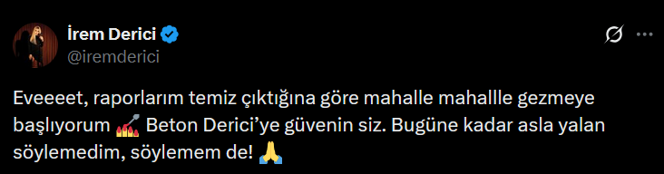 Uyuşturucu soruşturmasında adı geçen İrem Derici, test sonuçlarının temiz çıkmasının ardından sosyal medya hesabından bir açıklama gerçekleştirdi. Derici, "Beton Derici’ye güvenin siz" diyerekmahalle mahalle gezmeye başlayacağını söyledi.
