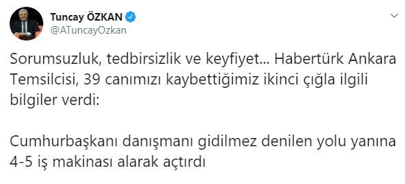 CHP İzmir Milletvekili Tuncay Özkan, sosyal medya hesabı üzerinden Bülent Aydemir'in konuşmasını alıntılayarak, "Sorumsuzluk, tedbirsizlik ve keyfiyet... Habertürk Ankara Temsilcisi, 39 canımızı kaybettiğimiz ikinci çığla ilgili bilgiler verdi: Cumhurbaşkanı danışmanı gidilmez denilen yolu yanına 4-5 iş makinası alarak açtırdı" diyerek tepki gösterdi.