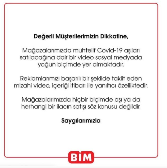 BİM'in Instagram hesabından yapılan açıklamada, "Mağazalarımızda muhtelif Covid-19 aşıları satılacağına dair bir video sosyal medyada yoğun bir biçimde yer almaktadır. Reklamlarımızı başarılı bir şekilde taklit eden mizahi video içeriği itibari ile yanıltıcı özelliktedir. Mağazalarımızda hiçbir biçimde aşı ya da herhangi bir ilacın satışı söz konusu değildir." denildi.
