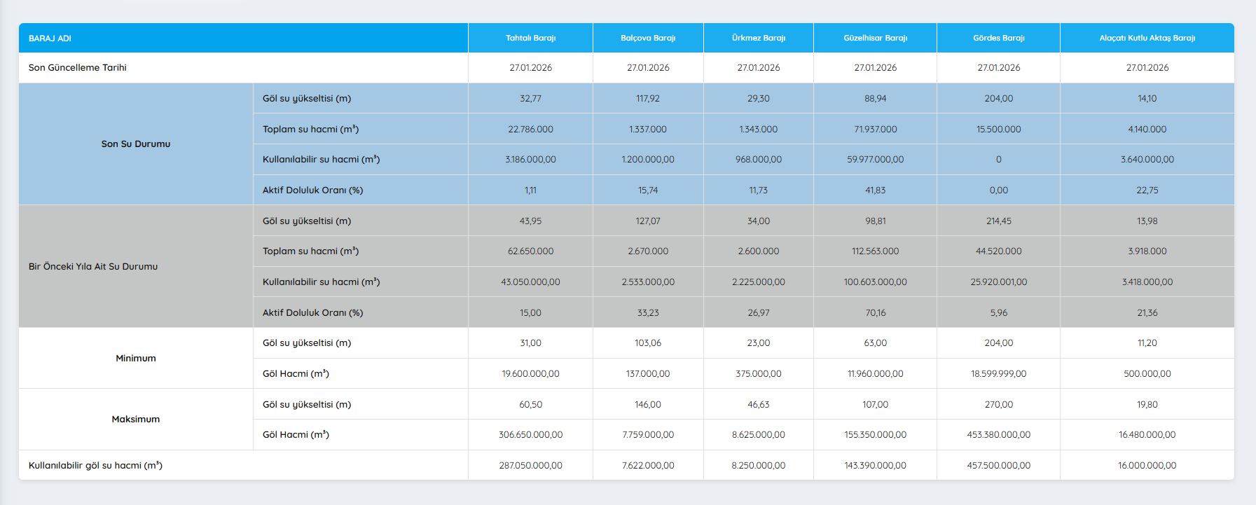 Son günlerde etkili olan sağanak yağışların barajlara sınırlı katkı sağladığı mevcut verilerle birlikte netleşti. Açıklanan doluluk oranları özellikle içme suyu açısından kritik öneme sahip barajlarda seviyelerin halen düşük olduğunu ortaya koydu. İZSU tarafından paylaşılan 27 Ocak 2026 tarihli resmi veriler, İzmir genelindeki su kaynaklarının mevcut durumunu ortaya koyarken barajlardaki doluluk oranlarının yakından izlenmeye devam ediliyor.
