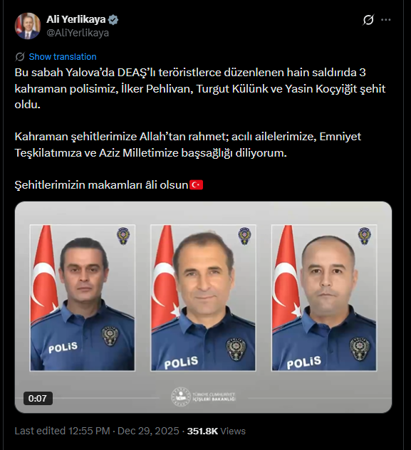 İçişleri Bakanı Ali Yerlikaya, paylaşımında şu ifadelere yer verdi: “Bu sabah Yalova’da DEAŞ’lı teröristlerce düzenlenen hain saldırıda 3 kahraman polisimiz, İlker Pehlivan, Turgut Külünk ve Yasin Koçyiğit şehit oldu. Kahraman şehitlerimize Allah’tan rahmet; acılı ailelerimize, Emniyet Teşkilatımıza ve Aziz Milletimize başsağlığı diliyorum. Şehitlerimizin makamları âli olsun”