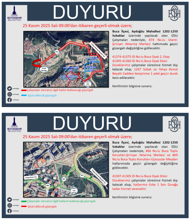 İzmir Büyükşehir Belediyesi’ne bağlı ESHOT Genel Müdürlüğü tarafından gerçekleştirilen açıklamada, Aydoğdu Mahallesi 1202–1250 Sokaklar üzerinde yapılacak çalışmalar nedeniyle 475 Tınaztepe Üniversitesi–Halkapınar Metro, 866 Buca Toplu Konutları–Şirinyer Aktarma Merkezi, 869 Buca Toplu Konutları–Üçkuyular Meydan ve 874 İzkent–Şirinyer Aktarma Merkezi hatlarının geçici olarak farklı güzergahlara yönlendirileceği belirtildi.Yolcuların sefer planlamalarını bu doğrultuda yapmalı. İşte güncellenen rotaları: