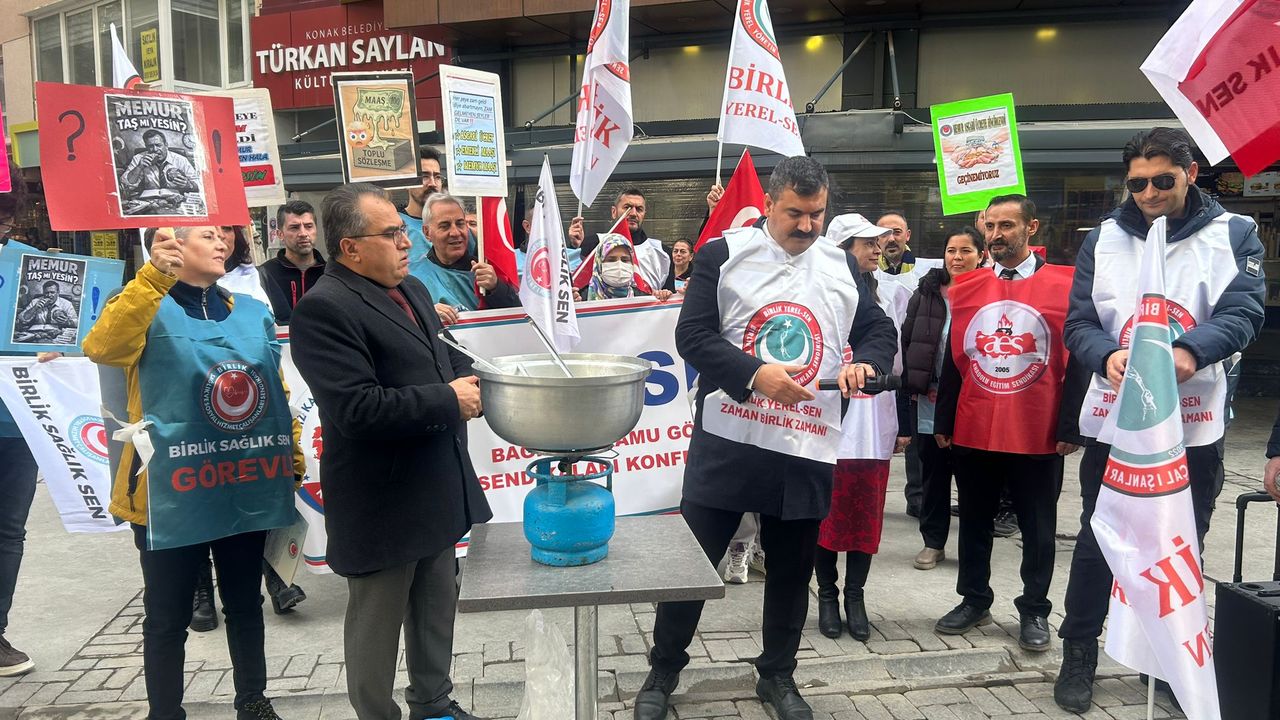 Memurlar, eylem alanına getirdikleri kazanda sembolik olarak taş kaynatarak zam oranlarına tepki gösterdi.